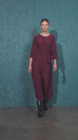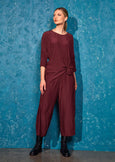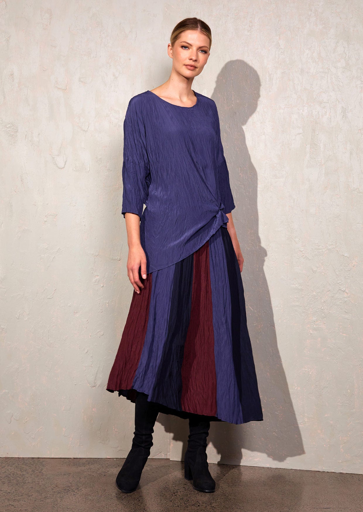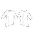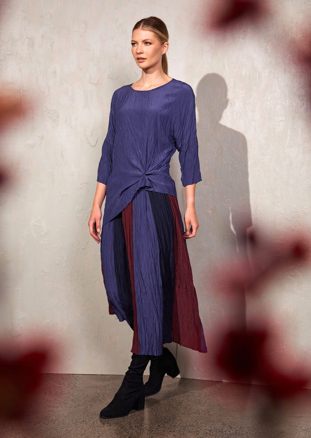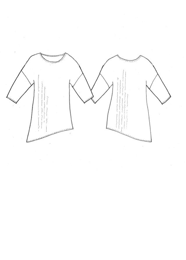 Asymmetrical top with round neck & 3/4 quarter dolman sleeve. Permanently vertically crinkled . Left side seam. Length from top neck point 64cm. Right size 79cm.