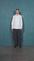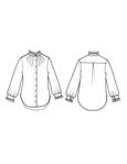 Shirt with raw self double edge ruffle on mandarin collar & on cuffs. Standard shoulder. Pin tuck detail in sunray pattern from front neck. Back yoke with centre inverted pleat. Back length 76cm with shirt tail shaping to sides.