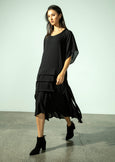 Elbow length bell sleeve dress. Dropped low waist with tuck detail and side sashes.